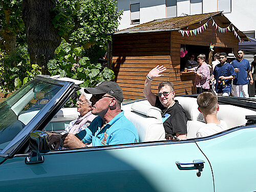Bad Nauheim (pm). Wer träumte nicht davon, einmal wie Elvis im Cadillac durch Bad Nauheim zu cruisen?! Für Bewohner im Diakoniewerk Elisabethhaus wurde der Traum wahr. Im Schulterschluss mit den guten Geistern des Hauses schenkten die „Gazette Kaffeehelden“ den Senioren und Angehörigen beim Sommerfest frohe Stunden – zum dritten Mal in Folge, weil’s so schön war und dem guten Zweck dient.