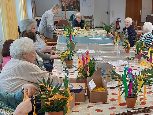 Am Palmsonntag haben die Bewohner*innen mit großer Begeisterung Palmsträuße aus Palmzweigen, Efeu und buntem Krepppapier gestaltet. Vergangene Woche wurden kleine Kunstwerke zu verschiedenen Bibelversen mit leuchtenden Farben erstellt.